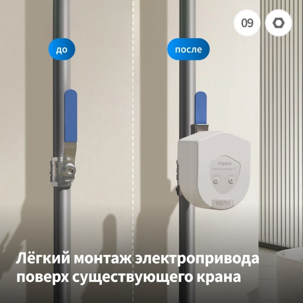 - Простая установка – установка не требует специальных навыков или сложного монтажа: датчик можно разместить в любом нужном месте, а электропривод устанавливается на стандартный кран.