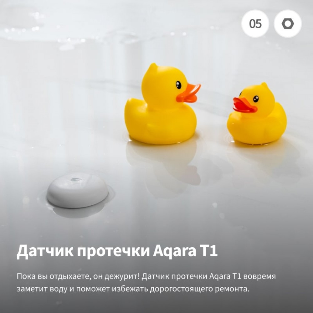 - 2 датчика протечки Aqara — компактные устройства, которые мгновенно реагируют на появление даже нескольких капель воды. Устанавливаются на полу возле труб, стиральной машины, под мойкой или батареями.
